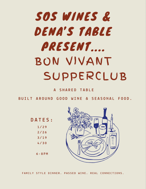 This winter, we’re doing something fun with Alison and Jason over at SOS Wine Shop on Main Street in Vermilion. The Bon Vivant Supperclub is a family style dining experience rooted in connection and great taste. Each gathering invites guests to slow down and come together around a shared table built around seasonal food + good wine.